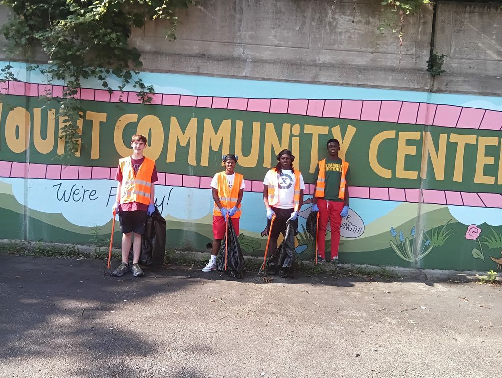 Our group of Youth Workers standing in front of the Keep Cincinnati Beautiful x North Fairmount Community Center mural on Carll St., after cleaning up litter